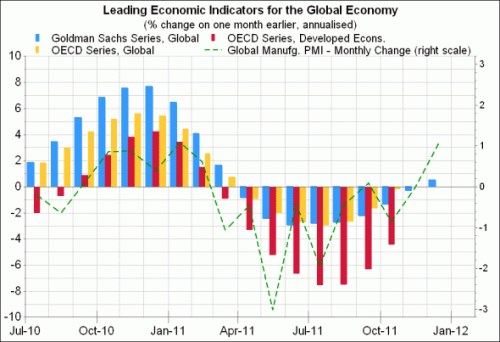 Ve druhé polovině roku 2011 se zdálo, že americká ekonomika odolává vlivu krize v eurozóně. S příchodem nového roku se ale zdá nepravděpodobné, že se ekonomická aktivita v USA a v Evropě bude nadále ubírat rozdílnými směry. Pro ekonomy je vždy těžké identifikovat obrat v průběhu globálního cyklu. V současném prostředí fiskálního utahování a celosvětového snižování dluhu nelze čekat, že by růst dosáhl úrovně nad trendem, riziko recese ale podle všeho také klesá.