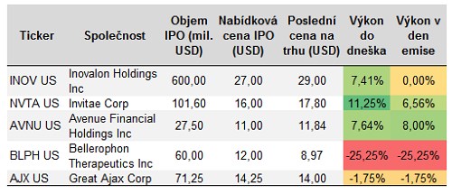 V sedmém týdnu jsme viděli reálně pět firem, některá IPO byla posunuta apod. Nicméně provedená IPO skončila poměrně pěknými výsledky za které by se řada investorů nezlobila. Nejlépe si vedla Invitae Corp a po sedmi procentech přidaly společnosti Inovalon Holdings a Avenue Financial Holdings Inc.