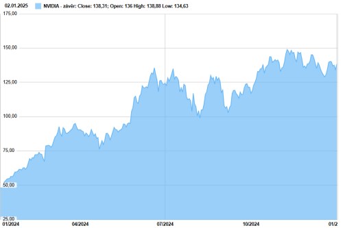 Nvidia, oblíbenec retailových investorů do umělé inteligence, v roce 2024 vzrostla o více než 171 %, což z ní dělá jednu z nejvýkonnějších akcií indexu S&P 500. Také znamenala pátý vítězný rok z posledních šesti.