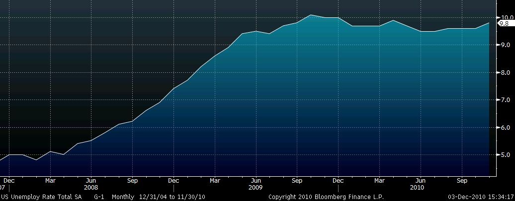 Míra nezaměstnanosti ve Spojených státech v měsíci listopadu navzdory očekávání trhu nepokračovala v sérii stagnací na úrovni 9,6 procenta, ale vzrostla hned o dvě desetiny na 9,8 procenta. Na vině je výrazně slabší tvorba nových pracovních míst, která jak z celkového pohledu (mimo zemědělský sektor), tak v samotném soukromém sektoru zaostala za očekáváním trhu nejméně o 110 tisíc míst, vyplývá z dnešních informací amerického ministerstva práce.