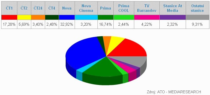 Stanice ze skupiny TV Prima, tedy Prima a Prima Cool, zaujaly v hlavním vysílacím čase 15,75 procenta, respektive 2,38 procenta diváků. TV Barrandov měla podíl na sledovanosti 3,69 procenta, stanice AT Media 1,57 procenta a ostatní televize 6,77 procenta.