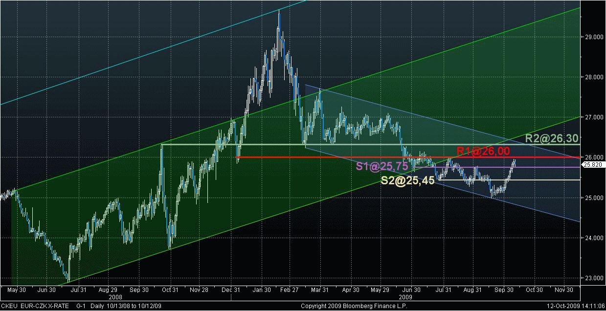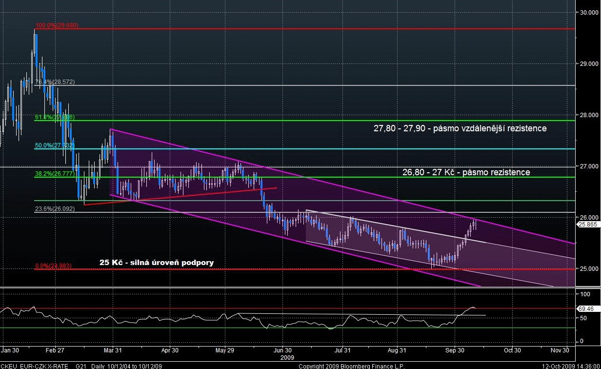 Dne 12. října 2009 jsme psali, že koruna může krátkodobě ještě posílit, střednědobě však nelze vyloučit pád až přes 27 CZK/EUR (v mezidobí od 12. října do dneška koruna skutečně ještě o několik haléřů krátkodobě posílila k 25,70 CZK/EUR). Následuje citace článku z 12. října kurzívou: