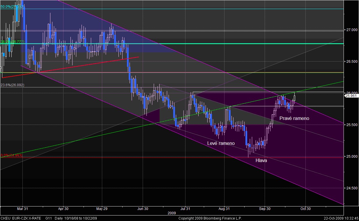Eurokorunový graf dnes dopoledne proťal sestupný trendový kanál směrem vzhůru a koruna oslabila až na 26 za euro. Z technického pohledu se na grafu rýsuje formace „otočená hlava – ramena“, která obvykle naznačuje změnu trendu (zde v rámci týdnů) z klesajícího na rostoucí. Nyní záleží na tom, zda se tato formace naplní protnutím krční linie (zelené), dnes na hodnotě 26 , a koruna oslabí k dalším rezistencím.