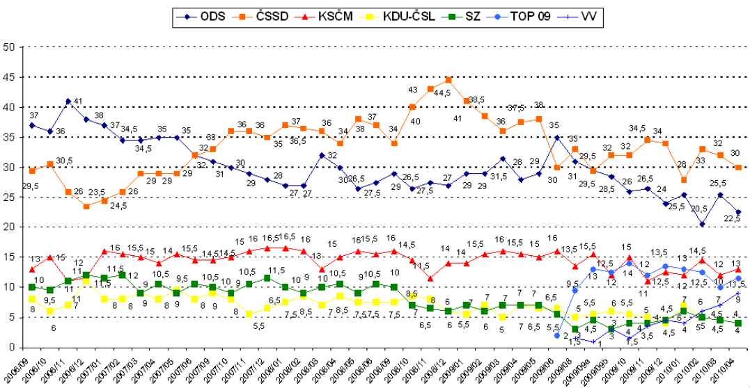 ČSSD sice relativně k ODS polepšila, když rozšířila svůj náskok o procentní bod na 7,5 procenta, ale celkově si meziměsíčně naopak pohoršila, a to o 2 procentní body z březnových 32 procent. Meziměsíční ztráta ODS je podle CVVM rovná 3 procentním bodům, jelikož došlo k poklesu z 25,5 procenta na dubnových 22,5 procenta.