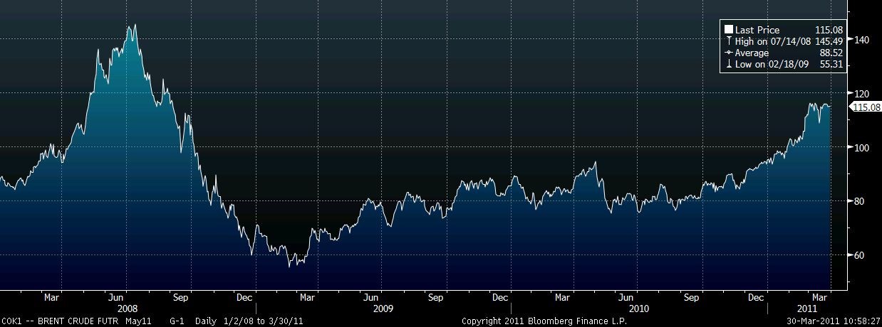 Vývoj cen ropy Brent od počátku roku 2008 (USD/barel):