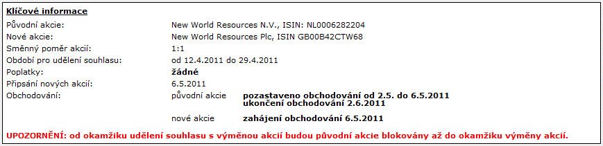 Co se stane, když dám souhlas se směnou akcií? Za zvláštně důležité pokládáme zdůraznit, že okamžitě po akceptaci navrhované směny je zablokováno nakládání s původními akciemi NWR, a to až do 6. 5. 2011. Pokud tedy chcete mít ještě v dubnu možnost s původními akciemi obchodovat, je radno s vydáním souhlasu počkat až do samotného konce akceptačního období (nutno ověřit s obchodníkem). S těmito původními akciemi bude následně (po akceptaci) pozastaveno obchodování na všech trzích v týdnu od 2. do 6. května 2011, kdy dojde k připsání nových akcií NWR Plc. Za směnu nejsou obchodníkem s cennými papíry účtovány žádné poplatky.