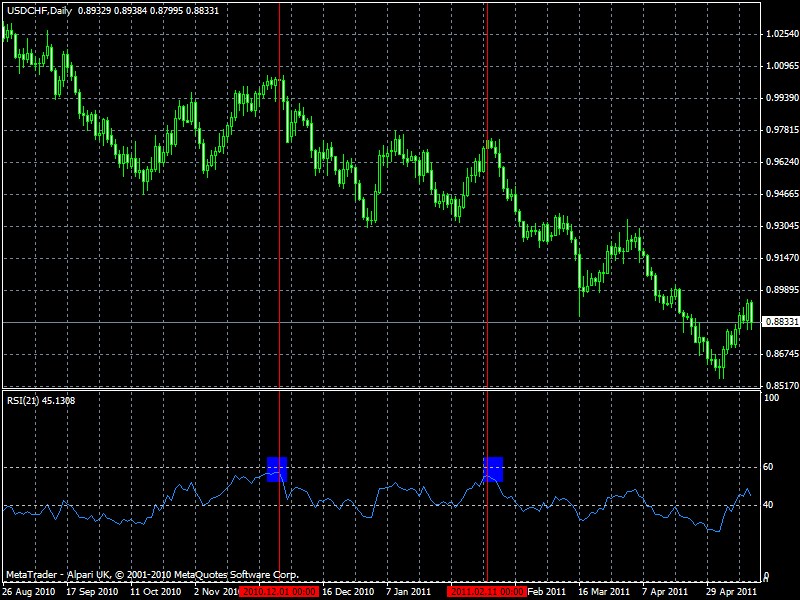 V dnešnej analýze by som rád venoval priestor páru USD/CHF, ktorý je štvrtý najobchodovanejší menový pár. Prišiel už čas kupovať americký dolár? Odpoveď nájdeme v technickej analýze na obrázku číslo jeden. Ako som v úvode spomínal, budeme cenovú históriu filtrovať. Dnešným filtrom je RSI (21), ktorý má takú danosť, že pri trendujúcom trhu vie ukázať býčí trh (Bull Range), ktorý sa pri RSI nachádza v rozpätí (40-100) a medvedí trh (Bear Range), pre ktorý v prípade RSI existuje pásmo (0-60). Ako vidíme v prípade Švajčiarskeho franku je jasné, že za posledný rok je pár v striktne medveďom trhu. Existujú dva prípady kedy sa RSI priamo priblížil alebo dotkol hodnoty 60 ale tým, že ju nepreťal, všetci predčasní býci škaredo prerobili. Preto sa ani my nebudeme pripájať do skupiny predčasných býkov a aj keď sa RSI dostane nad hranicu 50 ešte stále to neznamená signál na nákup dolára. Možno práve naopak. Všimnite si dva zvýraznené body na grafe, ktoré boli iba korekciou medvedieho trhu a nedočkaví býci prerobili.