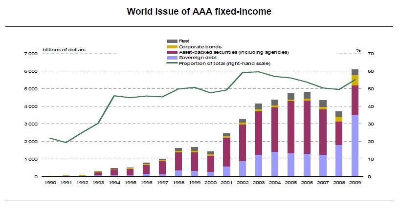 Jak lze sledovat i na přiloženém grafu, rok 2008 přinesl dramatický propad zastoupení ABS v nejbezpečnější třídě dluhových instrumentů. Jejich celkové zastoupení však kleslo jen dočasně a v roce 2009 už opět podíl "AAA" instrumentů dosahoval skoro 60 procent. Výpadek totiž rychle zaplnily emise státních dluhopisů s ratingem „AAA“. Poptávku po těchto cenných papírech totiž zvýšily centrální banky, které je přijímaly jako kolaterál při milionových půjčkách. Zostřená bankovní regulace rizik potom ke státním dluhopisům „nejvyšších kvalit“ přivedla také komerční banky. A kde je poptávka, nabídka dlouho nepokulhává...