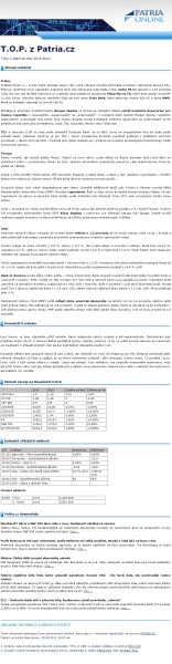 Chcete mít přehled o nejdůležitějších událostech z finančních trhů a ekonomiky, znát změny klíčových měn a indexů a nahlédnout do kalendáře očekávaných událostí? Registrujte si nový newsletter z Patria.cz a získejte tak exkluzivní souhrn zpráv a dat denně do Vaší e-mailové schránky zdarma. V sekci "Patria.cz doporučuje" navíc naleznete odkazy na nejzajímavější články či analýzy dne. Ukázka newsletteru je k dispozici ZDE.Newsletter je odesílán každý pracovní den mezi 17. a 18. hodinou. Zasílání tohoto denního přehledu lze nastavit v záložce Moje Patria - Moje e-maily. V sekci Články a komentáře zaškrtněte box u T.O.P - Trhy o páté z Patria.cz.Pro nastavení zasílání newsletteru je nutné být přihlášen. Pokud nejste registrovaným uživatelem portálu Patria.cz, registrujte se ZDE.