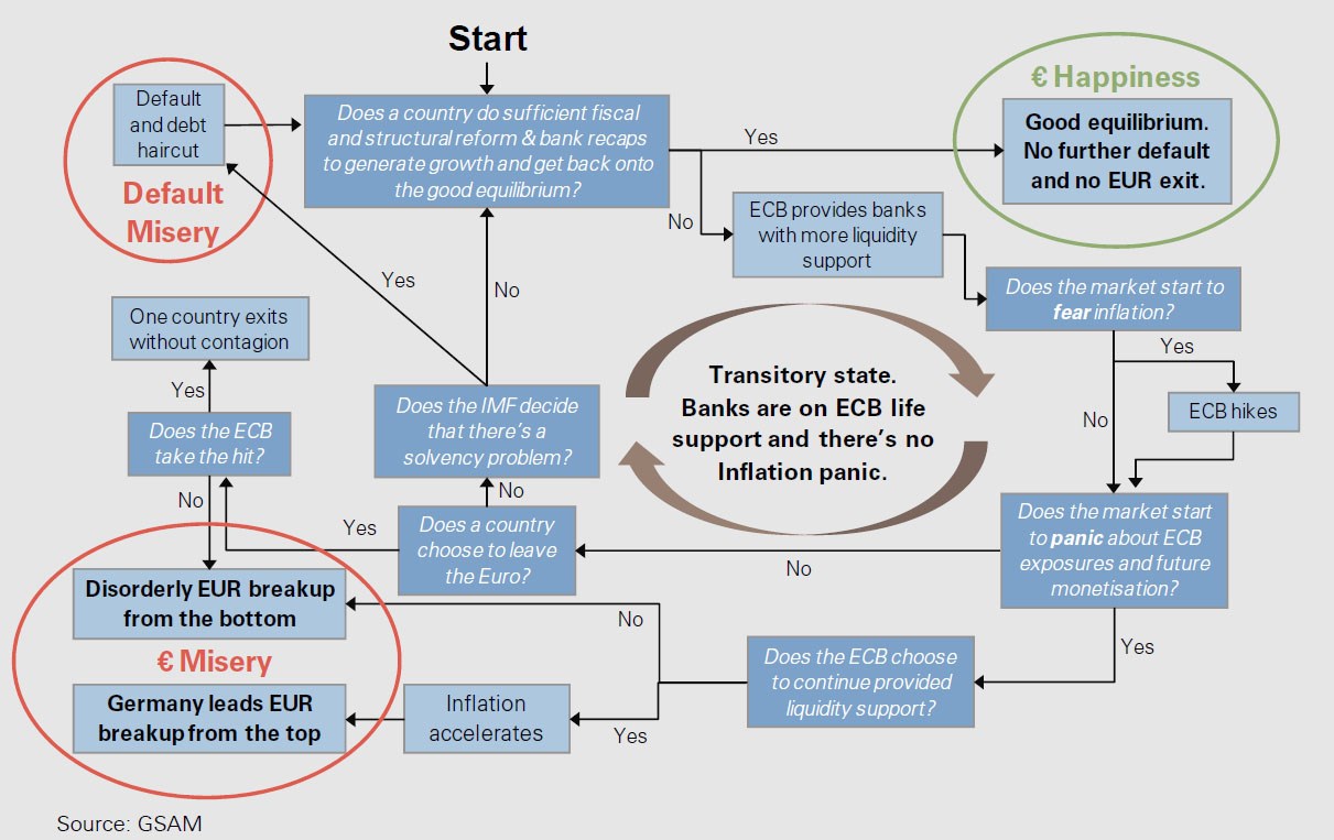 V rámci tohoto obrázku se analytici v čele s Jimem O’Neillem snaží zachytit rovnovážné stavy, k nimž směřují jednotlivé země eurozóny i celý blok – vpravo nahoře je to „blaženost“ (nízké výnosy státních dluhopisů, nízké a udržitelné zadlužení země); vlevo dole naopak „bída“ (vysoké výnosy a náklady na refinancování, klesající udržitelnost dluhu). Rozhodovací strom po agregaci pro všechny země eurozóny vede pro blok zemí platících eurem nakonec jen ke dvěma možným negativním a jednomu pozitivnímu závěru.