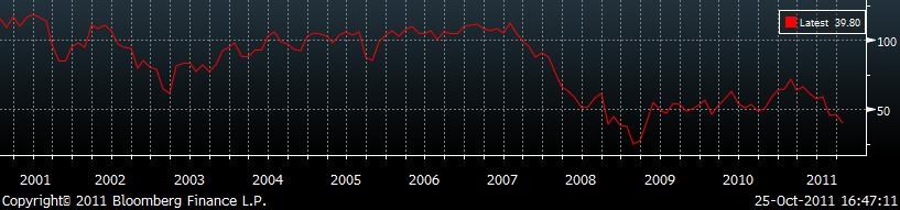 Negativně dnešní údaje vyzněly i proto, že konsensuální odhad agentury Bloomberg počítal naopak s růstem spotřebitelské důvěry v USA na 46,0 bodu z původně oznámených 45,4 bodu za měsíc září – dnes revidováno na 46,4 bodu. Takový propad neočekával ani nejpesimističtější ze 76 analytiků oslovených v průzkumu agentury Bloomberg (rozmezí odhadů 42,5 – 52 bodu). V průběhu rok a půl trvající poslední recese v USA byl průměr indexu spotřebitelské důvěry 53,7 bodu.
