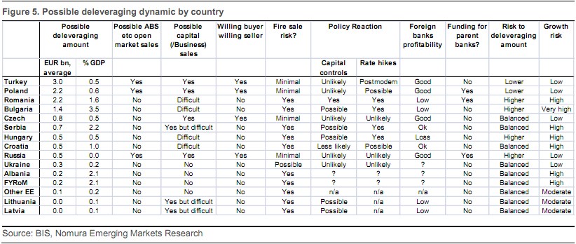 Na „optimalizaci rizikem vážených aktiv“ by mohly doplatit země jako Maďarsko či Polsko, které sice patří do EU, ale jejichž banky z valné většiny vlastní zahraniční subjekty. Mimo EU je zranitelné Turecko, Rusko a další země. Nomura přišla v pátek s analýzou, v níž vidíme, které země leží v první linii. Tabulka ve svých hlavních parametrech postupně ukazuje: Jakou částkou by jednotlivé země mohly přispět k oddlužení bank v eurozóně (v miliardách eur a jako podíl na HDP); zda hrozí možnost prodeje aktiv na volném trhu; zda existuje možnost prodeje podílu v bankách; zda existují potenciální kupci a prodejci; jaké je riziko možnosti rychlého prodeje a pravděpodobná reakce ze strany jednotlivých zemí – zavedení kontroly na tok kapitálu nebo zvýšení sazeb (unlikely – nepravděpodobné, possible – možné, less likely – méně pravděpodobné).