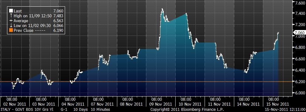 Výnos dluhopisu italské vlády s desetiletou splatností je znovu nad 7% hranicí, považovanou odborníky při současném slabém růstu italské ekonomiky za dlouhodobě neudržitelnou. Krátce před polednem už byl výnos na 7,09 procenta. Děje se tak navzdory zprávám z trhu dluhopisů, že dnes znovu intervenuje Evropská centrální banka (ECB), která italské obligace dále nakupuje. Několika denní uklidnění italské krize, které přineslo odstoupení premiéra Silvia Berlusconiho a nástup Maria Montiho, je dnes minulostí. Radost trhů vyprchala spolu s protahujícími se jednáními o sestavení nové italské vlády. Šéf italského sdružení zahraničních bank (AIBE) zároveň varoval před katastrofou, pokud nový italský premiér Mario Monti nebude schopen sestavit vládu. Euro dnes oslabuje pod 1,36 USD/EUR až na 1,3517 USD/EUR a evropské burzy včetně té pražské jsou opět pod tlakem prodejců. Investoři naopak utíkají k bezpečným německým dluhopisům, když výnos 2letého poprvé v historii padá pod 0,3 procenta.