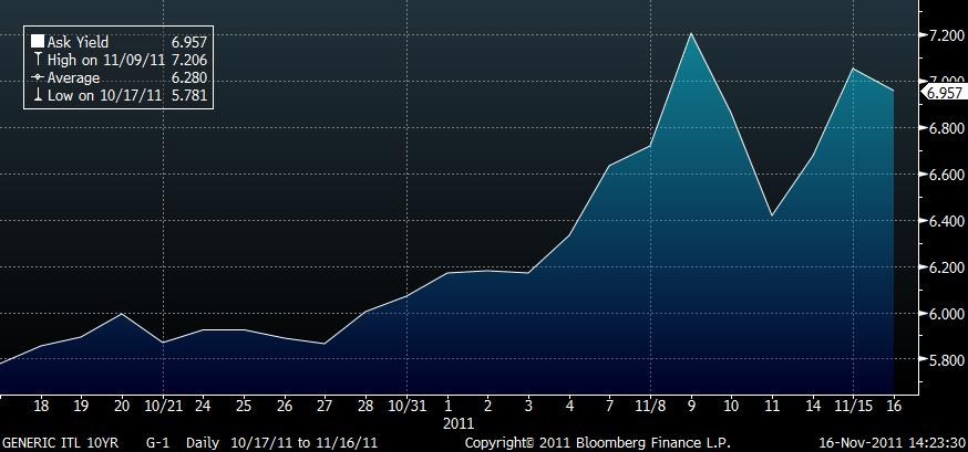 Aktualizováno Finanční trhy dnes znepokojilo oznámení italského národního statistického úřad ISTAT, že za třetí kvartál nezveřejní předběžné údaje o hrubém domácím produktu. Rychlost ekonomického růstu této ostře sledované země eurozóny tak bude známa až po vydání konečných dat 21. prosince. Výnos 10letého italského dluhopisu se tak dnes příliš nevzdálil od obávané 7% hladiny navzdory představení nové "technokratické" italské vlády, v níž premiér Miro Monti zastane i roli ministra financí (více ZDE).