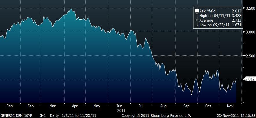 Průměrný výnos v dnešní německé aukci 10letých vládních obligací dosáhl 1,98 procenta proti 2,09% výnosu v říjnové aukci, ale trh na nechuť investorů skoupit celý nabízený objem reagoval růstem tržního výnosu 10letého dluhopisu o 10 bazických bodů na 2,017 procenta. Rozdíl mezi výnosem 2letého a 10letého vládního dluhopisu vzrostl o 10 bps na 164 bps, a dostal se tak nejvýše od 12. srpna letošního roku. Investoři přitom doposud v turbulentních dobách v Evropě německé dluhopisy nakupovaly ve snaze uchránit své finance. Dnes vzrostly také výnosy dluhopisů dalších zemí eurozóny. Výnos 10letých francouzských dluhopisů zatím roste o 10 bps na 3,63 procenta, u stejně dlouhých belgických dluhopisů o 13 bps na 5,21 procenta.