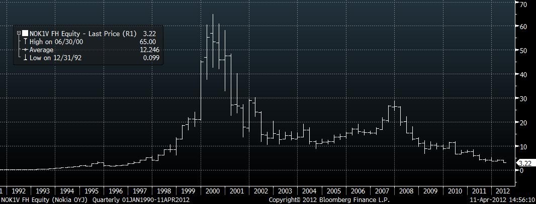 Aktualizováno Pouhých osm dní před představením výsledků hospodaření za první čtvrtletí varovala investory před slabšími ziskovými maržemi v hlavní divizi přístrojů a služeb. Lepší vyhlídky navíc společnost neposkytla ani v dnes prezentovaném výhledu pro druhý kvartál, což akcie tohoto finského výrobce mobilních přístrojů poslalo až o 20 procent níže na 3,10 EUR - úrovně nevídané od druhé poloviny roku 1997.