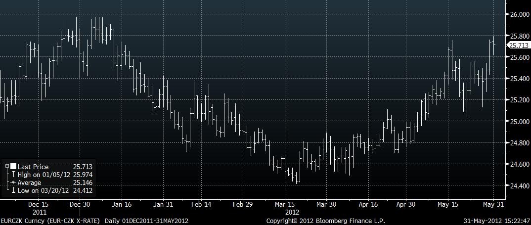 Nejistota, kterou dnešní data na trhy vlila, kormě oslabení akcií (panevropský index FTSEurofirst 300 -0,1 %, Wall Street otevřela ztrátou) posílila dolar, který opět donutil euro podívat se pod hladinu 1,24 USD/EUR. Nechuť investorů do rizika se však odrazila i na měnách v našem regionu. Koruna, která ještě dopoledne sbírala zisky vůči euru až k 25,60 CZK/EUR ihned otočila do ztrát a podávala se až na 25,785 CZK/EUR a 20,815 CZK/USD. Druhá vlna oslabení korunu zasáhla na samém závěru dnešní seance - uzavřela na 25,815 CZK/EUR a 20,878 CZK/USD. Vůči euru tak oslabila na úrovně, kde se česká měna neobchodovala od 12. ledna letošního roku.