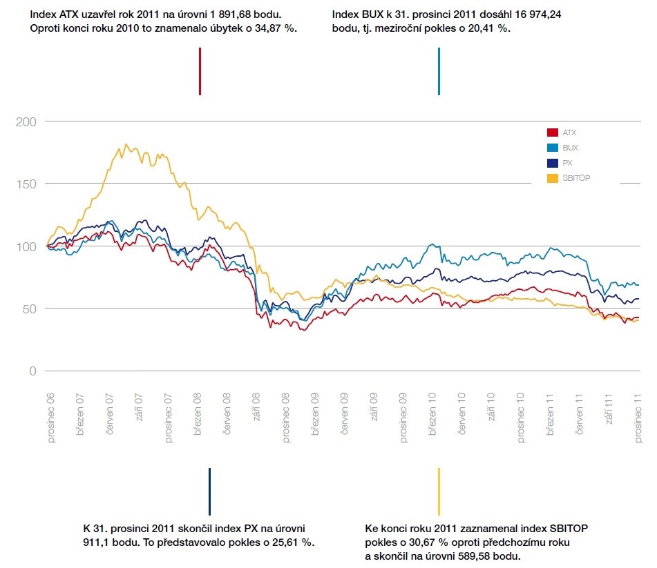 „Ačkoli se ukázalo, že mezinárodní kapitálové trhy jsou relativně odolné vůči hlavním globálním událostem z první poloviny roku 2011 (Japonsko, arabská povstání), a bez ohledu na ně vcelku pokračovaly v zotavení zahájeném v roce 2010, přesto bylo druhé pololetí zastíněno novými obavami vzešlými z trvající krize státních dluhů (především v Řecku), ze zpomalování ekonomického zotavení a z řady negativních přehodnocení růstových predikcí. V důsledku toho byla nálada v druhém pololetí roku 2011 spíše pochmurná. Kapitálové trhy se opět otřásly a akcie se na čas propadly na nová minima,“ píše se ve výroční zprávě CEE Stock Exchange.