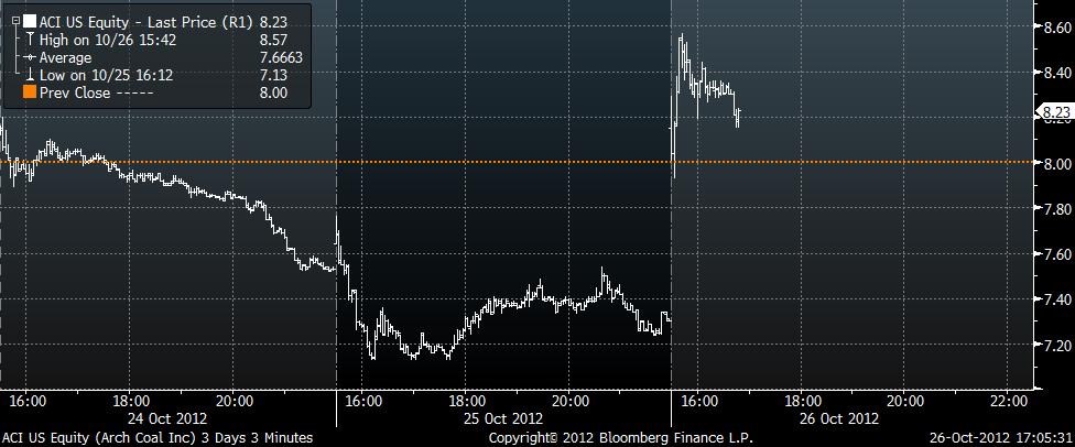 Reakce investorů byla velmi rychlá a silná. Akcie Arch Coal během pár minut v předobchodní fázi na Wall Street vylétly o více než 13 procent, aby po otevření trhu rozšířily zisky až nad 17 procent a denní maximum zkraje vytyčily na 8,56 USD. Od začátku roku přitom nepřízeň trhu vůči producentům uhlí srazila titul již o 50 procent. Důvodů k optimismu mají ale investoři uvažující o "uhlácích" nyní více. Akcionáři navíc získají za 3Q kvartální dividendu 3 centy na akcii, pro níž byl dnes stanoven rozhodný den na 30. listopadu 2012.