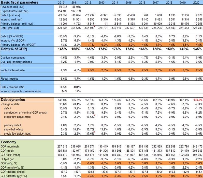 Popsaná opatření by mělo dovést Řecko k dluhu v roce 2020 na úrovni 124 procent HDP. Předpoklady v propočtech jsou nadále poměrně optimistické, od roku 2015 by měla řecká ekonomika růst poměrně svižným tempem. Zároveň se předpokládá udržení přísné fiskální disciplíny a tolerance řeckých obyvatel k pokračování drsné fiskální diety.