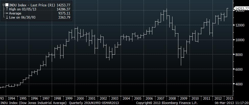 Aktualizováno Po asijském a evropském obchodování, také americké akcie uzavřely úterní seanci se ziskem. Nové kupce přilákaly na trh zprávy o pokračování stimulací v USA a ponechání cíle pro růst čínského HDP. Report indexu aktivity mimo zpracovatelský sektor ISM podpořil optimismus, když se v únoru vyhoupnul na 56 bodů, rovný bod nad očekávání ekonomů. Index DJIA , který sdružuje 30 nejobchodovanějších amerických společností, navýšil během obchodování svá historická maxima na 14286 bodů. Obchodování pak uzavřel se ziskem 0,9 %.