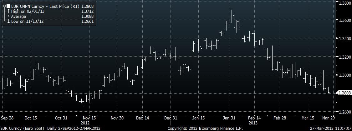 Eurodolar od včerejška klesl, první pokles z dnešního rána ještě zvládl korigovat, následuje ale další pohyb dolů a kurz se dostává až pod 1,28, kde se neobchodovalo od 21. listopadu 2012. Pro společnou evropskou měnu jsou dál negativní obavy z prosazení kyperského způsobu řešení problémů bank jako univerzálního pravidla i pro další případy. Krátce euro také znejistěly zprávy o tom, že volební vítěz Bersani nabízí velkou koalici Berlusconiho koalici, Bersani však takový záměr později odmítl. Nadále také mohou mít negativní vliv spekulace o snížení italského ratingu.
