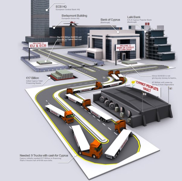 Více než 34 kamionů plných stovkových eurobankovek - odpovídajících 68,4 miliardám eur vkladů v kyperských bankách - se ve chvíli problémů Bank of Cyprus a Laiki Bank ukázalo jako přílišná nálož. A tak Kypr požádal o pomoc eurozónu. Původní žádost Nikósie mezinárodním věřitelům v překladu do naší řeči zněla: „Pošlete asi 9 kamionů (17 mld. EUR)“. Po zamítavé odpovědi od ECB ale padla kosa na vkladatele u bank.