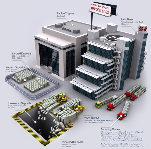 Kypr tak byl postaven před otázku, kde vzít potřebných 7 miliard eur a rozhodl se takto: Bank of Cyprus a Laiki Bank nechá řízeně zbankrotovat, evropskou regulací pojištěné vklady do 100 tisíc eur (31,5 miliardy eur) zůstanou netknuty, ale na větší vklady (36,9 miliardy eur) uvalí až 60% daň (či transformaci do bezcenných podílů ve zmíněných bankách).