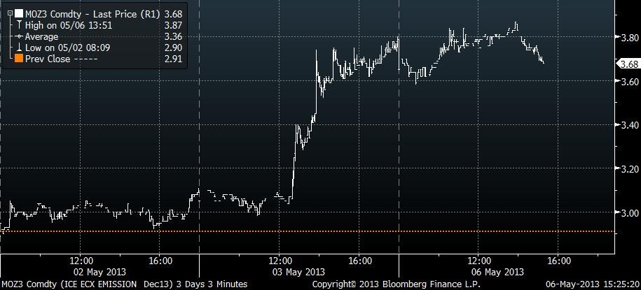 Cena emisních povolenek přesto po pátečních slovech Merkelové vyskočila až o 10 procent na 3,40 EUR/t, tedy nejvíce za dva měsíce a po dnešním ujištění o nutnosti nápravy fungování trhu s emisemi roste ještě výše až na 3,87 EUR/t.