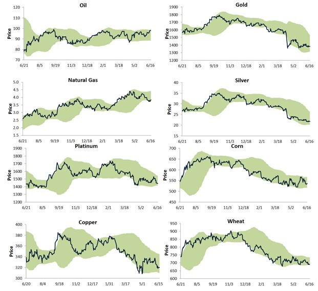 Příkladem efektu prvního je měď, která začala trpět až na počátku tohoto roku. Pokud má tento Dr. Copper nějaký predikční potenciál, který mu je občas přisuzován, nastalo znatelné zhoršení na poli globální ekonomiky. Podle mne je ale doktorova schopnost předpovídat dosti omezená a jeho cena odráží zejména vývoj v Číně. Příkladem druhého efektu je zlato a stříbro – tyto komodity slábnou už od října minulého roku. Z níže uvedených komodit drží své pozice jen ropa, do které výrazně promlouvá nabídková strana. A jediným růstovým zástupcem je zemní plyn, který je samozřejmě specifický břidlicovou revolucí.