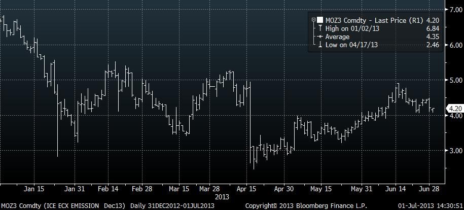Její kolega z New Energy Finance Richard Chatterton potom pro agenturu Bloomberg uvedl, že očekává, že ceny emisních povolenek vzrostou díky výsledku dlouho očekávaného hlasování Evropského parlamentu do konce týdne do rozmezí 4,8-5,0 eura za tunu CO2. Hodnota povolenek přitom klesala poslední čtyři kvartály v řadě a za ten poslední (2Q13) odepsala necelých 8 procent až na pátečních závěrečných 4,21 EUR/t.