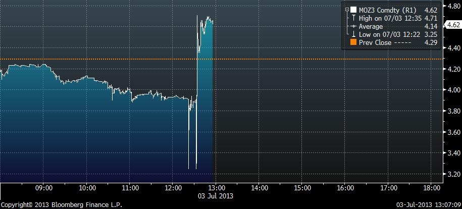 Na trhu s emisemi dnes byla cítit nervozita. Ceny emisních povolenek kolem poledne propadly za významného objemu až o 25 procent na 3,25 EUR/t, když byla nejprve zamítnuta mírnější varianta počítající s odsunem aukcí povolenek v letech 2013 až 2015. Po projití silnější verze ale povolenky okamžitě umazaly ztráty a rostlou až o 10 procent:
