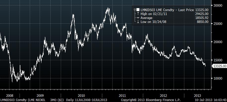 Nikl letos následoval pokles cen napříč komoditním trhem. Od ledna jeho kotace ztratily 22 % a včera na londýnské burze LME propadly na 13 205 USD za metrickou tunu. Naposledy se takto nízko pohybovaly v květnu 2009, kdy světem otřásala finanční krize. Index kovů LME, který nezahrnuje ocel, od začátku roku klesl o 15 %, což je za uvedené období nejvíc od druhé poloviny roku 2011, kdy na trhy dolehla prohlubující se dluhová krize v eurozóně.