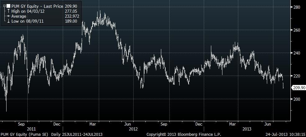 Akcie společnosti , které od začátku roku do včerejšího závěru ztratily již 7 procent hodnoty, po výsledcích za druhý kvartál propadly v úvodu o necelá 4 procenta až na cenu 208,75 EUR, a obchodovaly se tak neníže od 4. října 2011.
