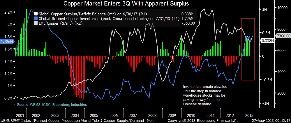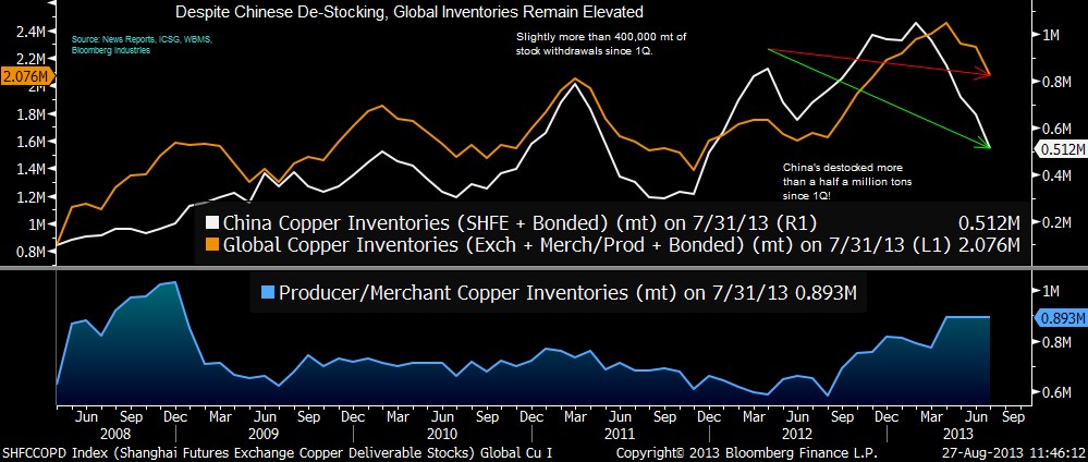 Zásoby mědi v Číně od prvního kvartálu letošního roku klesly již o půl milionu tunu asi na 512 tisíc tun, což komoditní trhy naplnilo optimismem. V celosvětovém měřítku dosáhl za stejné období pokles zásob mědi asi 400 tisíc tun a na konci července tak byly zásoby na úrovni 0,826 milionu tun mědi.