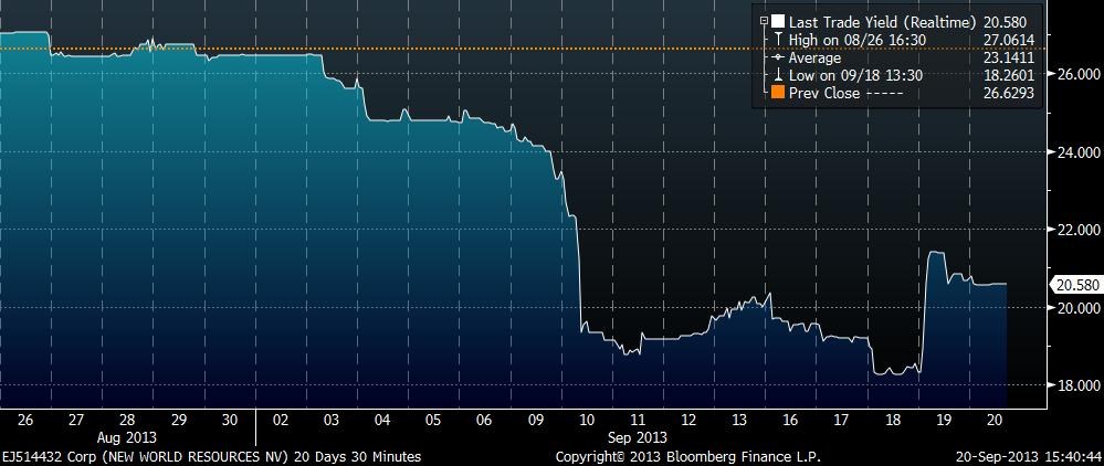 Od července vzrostly ceny koksovatelného uhlí o 16 procent, což analytici ING vidí jako důležitou podporu pro vývoj výnosů dluhopisů NWR. Poslední dva dny ale cena uhlí ztrácí spolu s celkovým poklesem energetických trhů, s nimiž je její vývoj citelně korelován. Koriguje se tak také růst cen akcií (dnes -9,4 %) i pokles výnos dluhopisu NWR splatného v roce 2021: