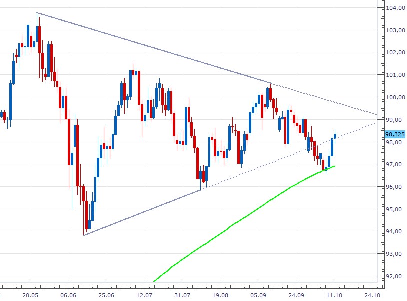 Pokud se měnový pár nicméně i během pondělka dokáže udržet nad spodní linií konsolidační formace, tak by došlo ke zneplatnění preferovaného scénáře a dolar by pak měl prostor k posílení až do pásma kolem 99,50 USDJPY.