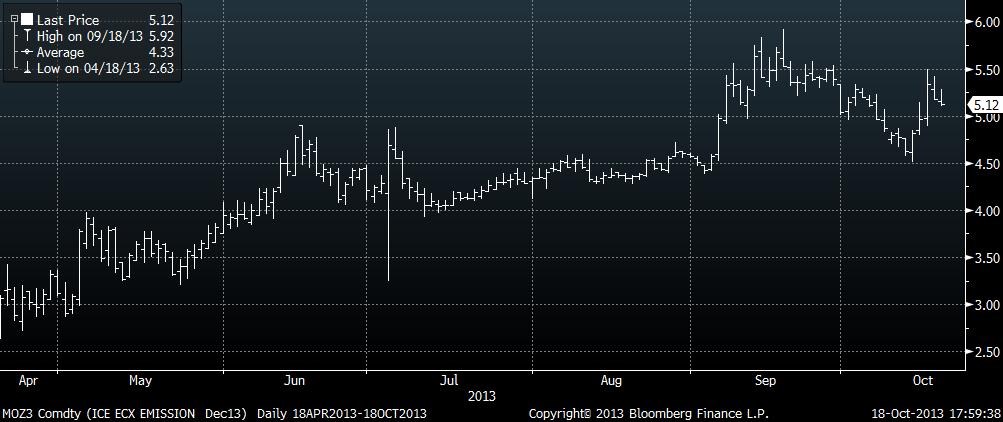 Reakce trhu s emisními povolenkami na poslední politický vývoj byla jednoznačná. Cena emisních povolenek vylétla tento týden skoro o 11 procent, což je nejlepší týdenní bilance od týdne zakončeného 6. září. Nejsilnější byla středeční reakce na prohlášení Angely Merkelové na podporu odkladu části emisních povolenek, kdy letošní emisní povolenky CO2 za den poskočily o 7,7 procenta a krátkou chvíli se obchodovaly dokonce za 5,50 EUR, což je nejvyšší intradenní úroveň za poslední měsíc.