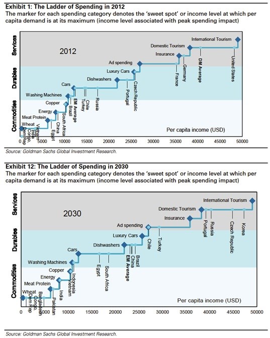 Následující dva grafy od ukazují, jak se vybrané reprezentantky globální ekonomiky postupně šplhají po žebříku konzumní nasycenosti. Na horizontální ose je úroveň příjmů na hlavu, posun směrem nahoru ukazuje, jak se s rostoucími příjmy mění to, čemu můžeme říkat centra spotřeby. Konkrétně jde o kategorii spotřeby, která je v daném bodě na výdajovém maximu. První graf je pro rok 2012, druhý pro rok 2030. V obou je intuici odpovídající zobrazení toho, že s rostoucími příjmy se spotřeba posouvá od komoditního typu ke zboží dlouhodobější spotřeby až po služby.