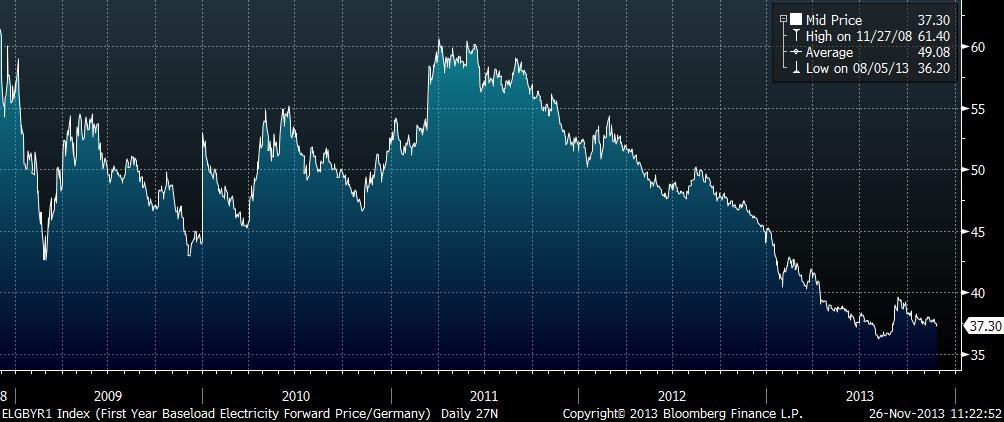 „Roční futures kontrakt pro cenu elektřiny se pravděpodobně v příštím roce odrazí ode dna,“ prohlásil dnes Alan Svoboda obchodní ředitel skupiny . „Prostor pro další pokles v příštím roce je již omezený,“ dodal. Cena ročního kontraktu na dodávku silové elektřiny na německé energetické burze od začátku roku 2013 propadla již o 17 procent, dnes roste o desetinku procenta na 37,3 EUR/MWh.
