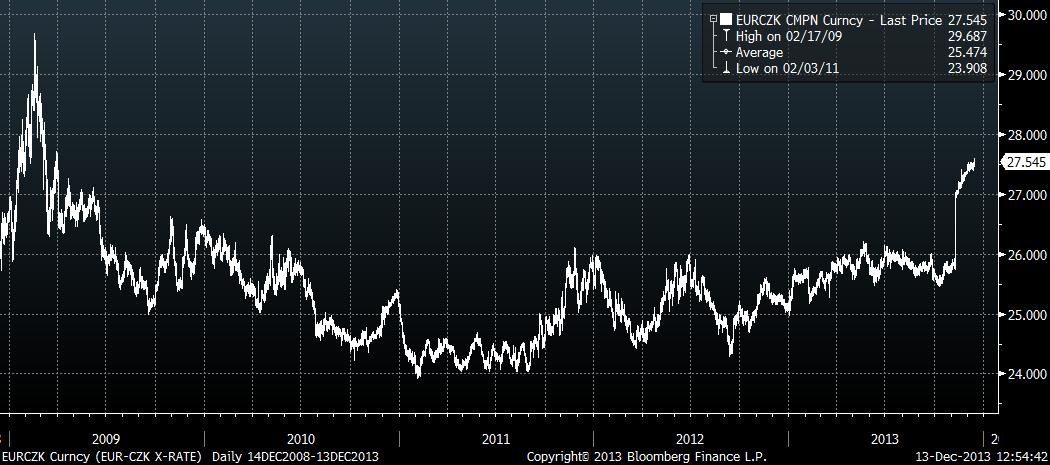 Nová data zastupuje běžný účet za říjen, jde však o číslo, které mívá na trh vliv pouze ojediněle při velmi překvapivých výsledcích. Tentokrát navíc běžný účet odhady překonal. Vedle toho pravděpodobný budoucí premiér Bohuslav Sobotka na dnešní tiskové konferenci prohlásil, že by se Česká republika mohla v příštím roce připojit k fiskálnímu paktu Evropské unie. Zdrženlivější byl Sobotka opět k možnosti vstupu České republiky do eurozóny.