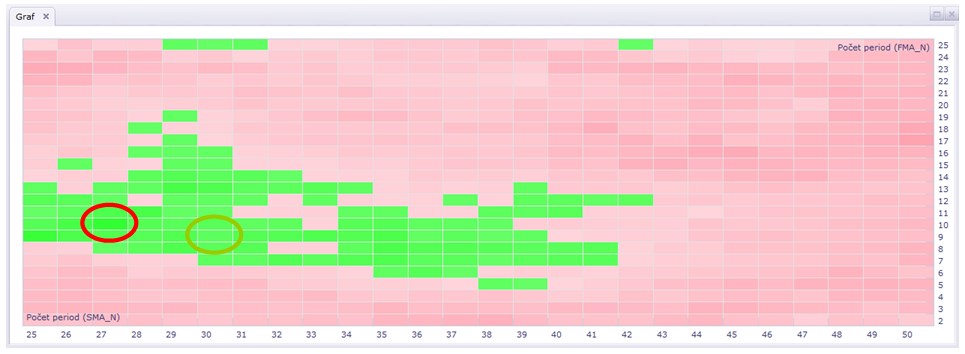 hodnotu 30 a FMA na hodnotu 9 (znázorněno zeleným oválem). Kombinace SMA 30 a FMA 9 je totiž, jak je dobře zřejmé z obrázku, obklopena značným počtem ziskových kombinací, a proto je pravděpodobné, že i v případě změny charakteru obchodovaného trhu by systém s takovýmto nastavením mohl solidně fungovat.