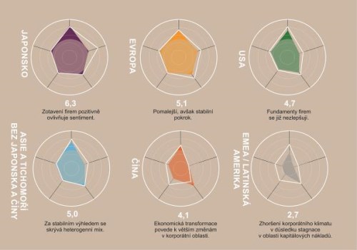 Japonsko je nejlepší zemí, co se hodnocení investičního sentimentu týče, Evropa vykazuje pomalejší, ale stabilnější pokrok, zatímco znepokojivá situace na rozvíjejících se trzích, zejména mezi zeměmi závislými na komoditách, nutí postupovat investory velmi obezřetně. Podle výsledků průzkumu analytiků společnosti Fidelity International fundamenty evropských a amerických firem, tedy klíčové podnikové ukazatele zaměřené na hodnotu pro akcionáře a návratnost kapitálu, budou i nadále srovnatelné s loňským rokem – možná poněkud lepší v Evropě a mírně horší v USA. Dobrý investiční sentiment v Japonsku pozitivně ovlivnilo zotavování tamních firem. Zpomalení Číny bude mít nulový nebo mírně pozitivní vliv na strategické investiční plány firem.