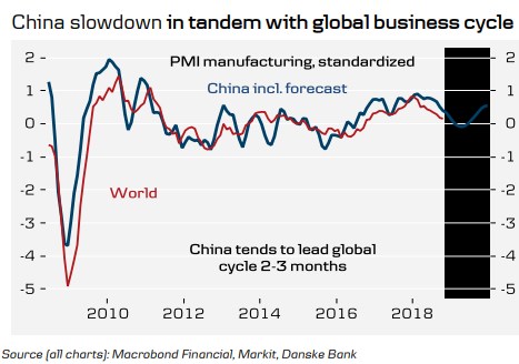 Ve výše uvedeném obrázku je také uveden standardizovaný vývoj globálního PMI. Danske tvrdí, že vývoj v Číně předbíhá ten globální asi o dva až tři měsíce. Pokud se tedy banka ve svých projekcích nemýlí, globální ekonomika by měla být až do poloviny roku 2019 v růstovém útlumu a pak by se měla vydat stejným směrem jako Čína. U ní je pak dobré mít stále na mysli, že neřeší jen výzvy cyklické, nýbrž (jak bylo zmíněno v úvodu) i strukturální, a to monumentálních rozměrů.