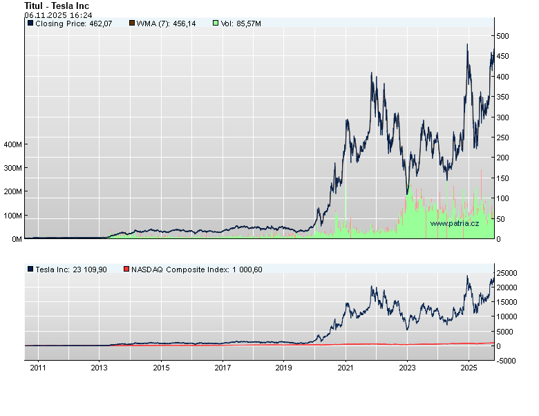 Graf: Dlouhodobý vývoj akcií TSLA (USD/akcie):