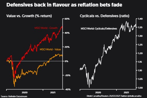 Tohle teď může končit. “Růstové” akcie, především technologie, od začátku července překonávají svoje hodnotové protějšky o více než 3 procentní body. Mnoho klientů se domnívá, že cyklická rotace byla pouze krátkodobým jevem, který pohánělo zotavování z neobvyklé recese.