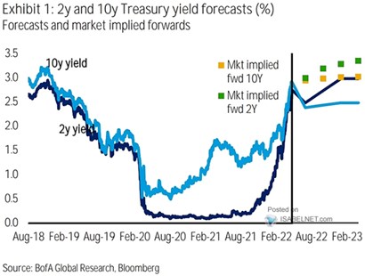 Trhem implikované výnosy desetiletých dluhopisů by měly znatelně ubrat na růstu, ale stále růst. Ještě více by to mělo platit o výnosech dvouletých obligací a výnosová křivka by se tak měla posunout do výrazné inverze. To samé ohledně inverze predikuje BofA, i když s celkově nižší úrovní výnosů. Jelikož zástupci Fedu celkem běžně hovoří o růstu sazeb někam na 2,5 – 3 %, není predikovaný pohyb výnosů krátkodobých tak překvapivý. Možná až umírněný ve světle úvah o tom, že Fed bude možná muset sazby zvednout nad sazby neutrální.