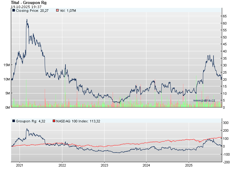Akcie Groupon již v dosavadním průběhu letošního roku posílily o řádově 30 procent. Do historického maxima z úvodu roku 2021 jim přesto zbývají ještě další čtyři pětiny cesty vzhůru, pokud by jej chtěly zopakovat.