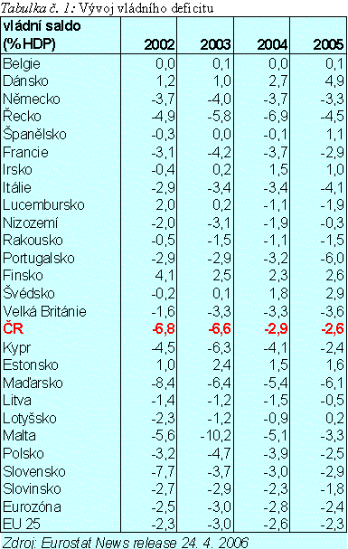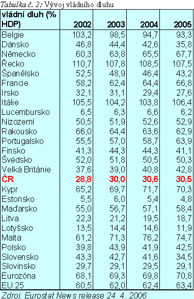 Z odhadů vládního deficitu v metodice ESA 95 za roky 2004 a 2005 vyplývá, že se ČR nachází pod referenční hodnotou 3 % HDP, která je používána při hodnocení dodržování rozpočtové disciplíny členských zemí a je jedním z Maastrichtských konvergenčních kritérií. V roce 2005 je vládní deficit ČR mírně nižší, než činí průměr EU 25. Z vývoje deficitu za roky 2004 a 2005 je patrný trend ke snižování vládního deficitu, který je ovšem narušen očekáváním roku 2006, kdy Ministerstvo financí odhaduje vládní deficit ve výši 114,0 mld. Kč, tj. 3,6 % HDP. Pokud jde o vládní dluh ČR, jeho úroveň je stále na relativně nízké úrovni ve srovnání s referenční hodnotou 60 % HDP. Výše vládního dluhu ČR nedosahuje ani poloviny průměru EU 25.