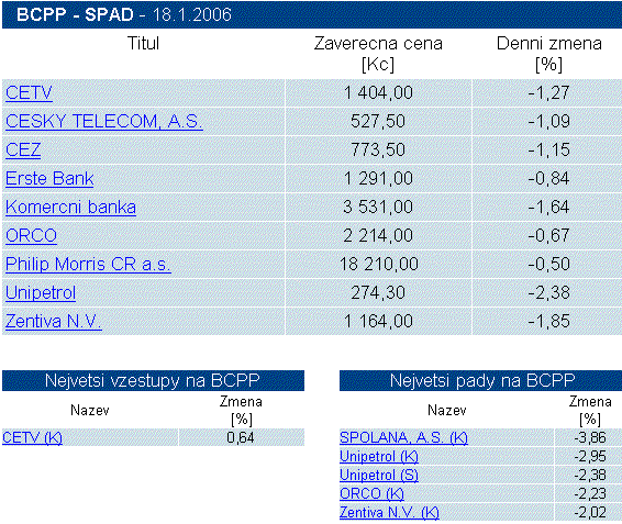 Českému Telecomu nepomohlo ani zvýšené doporučení analytiků Morgan Stanley. Po předešlém historickém maximu klesaly akcie elektrárenské společnosti ČEZ, kde se na hodnotách okolo 770 Kč opět kupovalo. I díky tomuto stavu se neutrhla větší prodejní lavina, která by smetla celý trh ještě víc. Prodejci se nechali vidět i na Zentivě, ale i zde zafungovala hodnota 1159 Kč a následně akcie již neklesaly. Po otevření na 3530 Kč našla svou hodnotu Komerční banka a její akcie oscilovaly mezi touto úrovní a 3550 Kč.